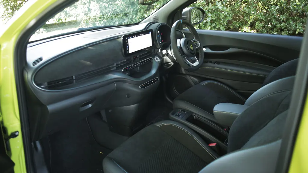 Sound is what sells an Abarth. Always has. So to be successful, 500e has to sound like no EV ever has. It does. The brand has installed a set of speakers beneath the car to faithfully reproduce the engine note of one of its rorty petrol powerplants. And the speakers are linked to the throttle so that as you accelerate, the sound builds, just as it would in a 595 or 695. It sounds remarkably realistic too - and you don't have to take our word for it; a sound generator on the Abarth website will play the powerplant to you. You might dismiss that as a gimmick, but you can't argue with the performance facts here. Namely that the 500e is an all-round faster car than the 595 petrol model it replaces - which doesn't initially seem very likely given that it's much heavier and has 20bhp less in total output. Set against that though, is that the full 152bhp output is of course available immediately, rather than hampered by the turbo lag you'd get in the petrol versions. That instant torque (234Nm of it) propels the car from rest to 62mph in just 7 seconds flat. Even more significant is the 25 to 37mph overtaking increment time of just 1.5 seconds (a full second faster than the 595). 12 to 25mph takes only a second (50% faster even than the 695). Abarth says the car is a second faster around Alfa Romeo's Balocco test track than the 695. There's the usual single-speed EV auto transmission and you work it through three drive modes - 'Turismo', 'Scorpion Street' and 'Scorpion Track' - which can alter brake regen strength and power output.