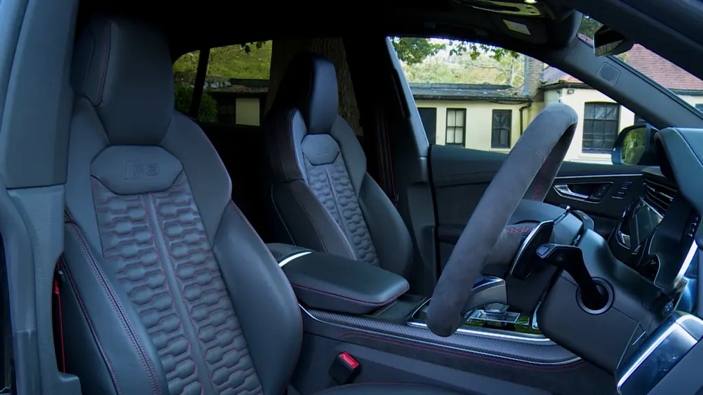 Visual changes here are slight, but an original RS Q8 owner might spot the honeycomb front grille and lightly revised front and rear styling. As before, there's plenty of pavement theatre here, as you'd expect from a coupe-style large sporting SUV, especially one this powerful. Specific touches here include RS bumpers, RS widened wheel arches, RS dual-branch tailpipes and an RS Manhattan grey front spoiler lip and rear diffuser insert. Plus the imposing octagonal single frame front grille gets a Manhattan grey surround. HD matrix LED headlights flank the grille and at the back, there's the full-width light strip which is characteristic of all high-end Audi models as part of a customisable OLED light panel. The wheels are 22-inches in size, with a 23-inch option on the Performance model. At the wheel, this updated model features an upgrade to the 12.3-inch digital instrument cluster, which now features a gearshift indicator for optimal shifts when in manual mode. There's a head-up display too. Copious use of alcantara trimming differentiates the cabin from that of a more ordinary Q8. A key interior highlight lies with Audi's superb winged Super Sports seats, which are trimmed with diamond-stitched Valcona leather upholstery. As usual in a large luxury Audi, the centre part of the fascia is made up of two large touchscreens with haptic and acoustic feedback. The upper 10.1-inch MMI display, which is integrated in a large high-gloss black bezel, is almost invisible when switched off and is used to control the infotainment and navigation systems. The brand has now widened the range of apps available on the MMI infotainment system to include third party providers like Spotify and Amazon Music. You'll use the lower 8.6-inch display for managing the heating and air conditioning functions, as well as convenience features and text input (which can be done with your fingertips). Unlike the SUV this model is based on, the Q7, this design can't offer a third seating row, but Audi insists that there's ample room for three people across the back seat, pointing out that the interior space exceeds that of the direct competitors in almost all relevant dimensions. The 'rear bench seat plus' package is standard, which means that the rear seat can slide and recline. The luggage compartment holds 605-litres, which increases to 1,755-litres with the rear backrests folded down. Two golf bags can easily fit in diagonally.