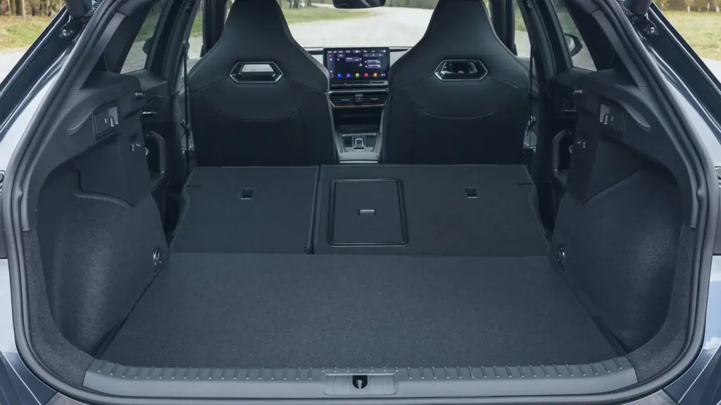 There are no significant visual changes differentiating this PHEV variant from other Formentors. As with the latest CUPRA Leon e-Hybrid, this updated Formentor e-Hybrid gets the brand's latest 'shark nose' front end that sees the car gain a broader grille and triangular-shaped LED headlights. The rear CUPRA badge is now illuminated. As before, the Formentor sits a little lower than most other performance SUVs and Crossovers. In fact, it's a full 150mm lower than the Ateca that it is based on and only 50mm higher than the CUPRA Leon hatchback. In terms of size, think Volvo XC40 or Audi Q3, but it has more pavement presence than either of those two cars, the design emphasis being on a long bonnet, which coupled with the lower height, gives the car a very dynamic appearance - and one that is completely distinctive. Inside, the main change with this updated model is the adoption of a larger 12.9-inch central touchscreen which runs new operating software. The touch-sensitive slider controls for temperature and volume are now back-lit too. And the cabin materials are more environmentally-conscious; the cloth upholstery on the optional bucket seats is, for instance, now made from a 73% vegan textile. As before, there's lots of brushed, dark aluminium with copper accents. And a fully-customisable 10-inch digital instrument binnacle; sitting behind a flat-bottomed steering wheel that houses both the engine start button and the 'CUPRA' driving mode buttons. There's the usual stubby VW Group auto gear lever. And a lovely orange LED strip that circumnavigates the top of the dash, flowing into the doors. The rear seat could comfortably take a couple of adults - but three would be tight. And out back, there's a 345-litre boot (down in size from the 420-litre space you get in the conventionally-engined models). With the seats folded, the e-Hybrid's total capacity is 1,370-litres.