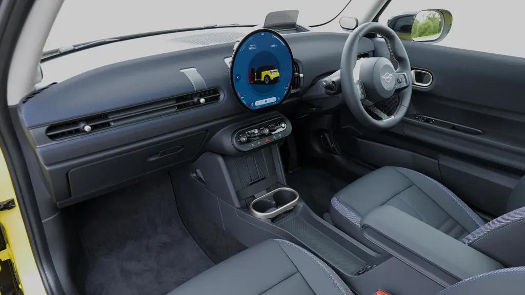 At the time of this Review in Spring 2025, prices for this combustion 3 door hatch started at around £25,000 for the entry-level 1.5-litre Cooper C, while the 2.0-litre Cooper S cost from just over £28,000. For reference, at the time of this combustion model's introduction, the 40.7kWh Cooper Electric E was around £27,000 and the 54.2kWh Cooper Electric SE was around £30,000. Whichever version you choose, MINI boasts that this is its most connected car ever, courtesy of a revised 'My MINI' app; and a "Hey MINI" personal assistant voice control system, via which owners can choose digital depiction of a British bulldog named Spike as their screen avatar of choice. There are three available trim levels - 'Classic', 'Exclusive' and 'Sport' - and all are well equipped. The knitted textile dashboard gets a two-tone houndstooth pattern with 'Exclusive' trim and a multi-coloured finish with 'Sport' spec. The black synthetic leather sports seats get perforated trim with 'Exclusive'-spec and contrast red stitching on 'Sport' models. You'll need to avoid base spec to get a contrast-coloured roof, a 'Spray-Tech' top which blends three different colours. Key available features include 'Park Assist Plus' parking set-up, 'Digital Key Plus' (which allows you to unlock the car with your smartphone) and the 'Remote 360' surround view monitoring system. On longer journeys, the Active Cruise Control with Stop & Go function, and the 'MINI Driving Assistant' enhance comfort. The 'MINI Interaction Unit' central screen offers 'Apple CarPlay' and 'Android Auto', but only the former fills the whole circumference of the 24cm-diameter OLED round display. Third-party apps like Spotify now fit and work in it too.
